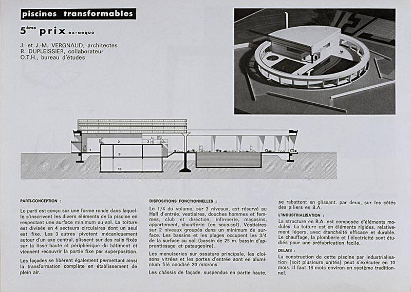 'Opération 1000 piscines' : concours nationaux sur le thème de la piscine, organisé par le Secrétariat à la Jeunesse, aux sports et aux loisirs, 1969-1970 : présentation des projets primés : 5e prix ex-aequo dans la catégorie des piscines transformables : vue d'ensemble et coupe transversale.