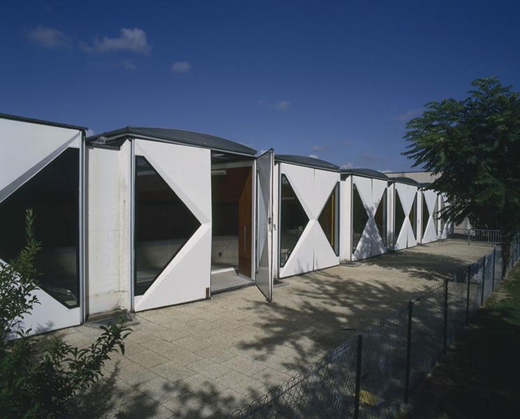 Vue latérale de la façade formée de structures modulaires préfabriquées.