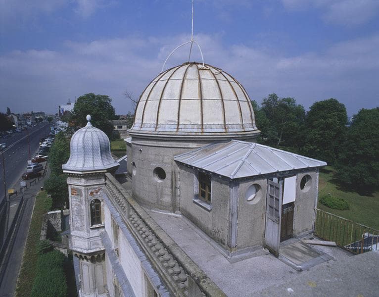 La coupole abritant la lunette astronomique sur la terrasse de l'observatoire Camille-Flammarion, avec, à l'arrière-plan, le parc et la R.N. 7.