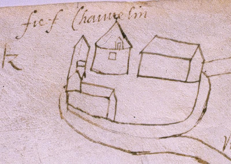 Détail d'un plan cavalier de Juvisy, d'Athis-Mons et d'une partie de Viry-Chatillon, dessin à la plume sur parchemin non signé non daté (entre 1556 et 1625) montrant le fief Chauvelin, c'est-à-dire la ferme de Fromenteau.