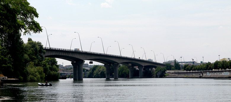 Choisy-le-Roi, Alfortville, Vitry-sur-Seine. Pont de Choisy de l'A86. Vue d'ensemble depuis la rive d'Alfortville.