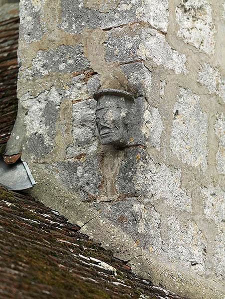 Détail du chevet : culot sculpté en forme de tête, ayant peut-être porté une colonnette, sur le contrefort sud de l'abside (aujourd'hui partiellement englobé dans la sacristie).