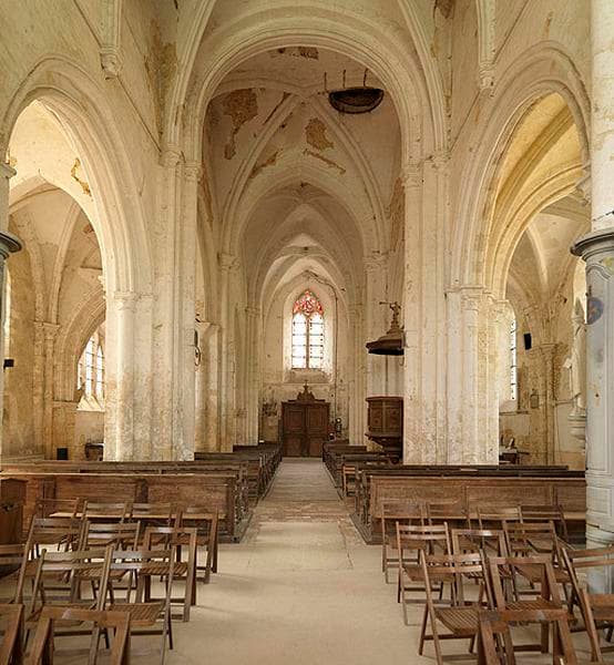 Vue intérieure, vers l'ouest, depuis la 4e travée. On voit au centre la travée du clocher.