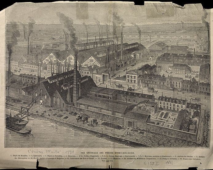 Ivry-sur-Seine, usine métallurgique dite Forges Coutant, boulevard Paul-Vaillant-Couturier. Vue générale des forges d'Ivry-sur-Seine. Il s'agit de la même gravure que celle reproduite dans : J. Turgan, Les grandes usines en France et à l'étranger, t. XIV, 1882. Tiré de : L'univers illustré, 1881. ( Musée de la batellerie, Conflans-Sainte-Honorine. Fonds Carivenc, C158-1)
