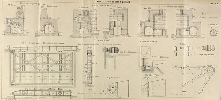 Alfortville, Vitry-sur-Seine. Barrage éclusé de Port-à-l'Anglais. Nouvelle écluse de Port-à-l'Anglais. Elévations, plans et coupes. Tiré de : Note sur la construction d'une nouvelle écluse à Port-à-l'Anglais sur la Haute-Seine / M. Alby. In Annales des Ponts et Chaussées, 3e trimestre 1902, n°30.