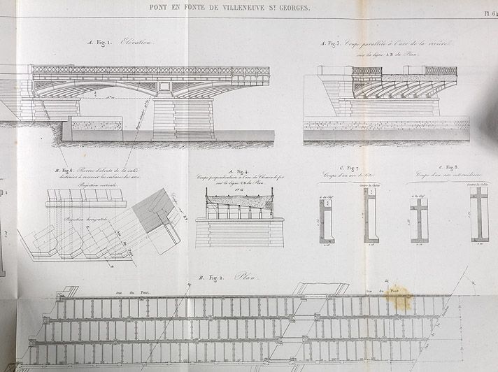 Villeneuve-Saint-Georges. Pont ferroviaire sur l'Yerres. Elévation, coupe et détails de construction du pont en fonte. Tiré de : Notice n° 81 sur le pont biais en fonte de Villeneuve-Saint-Georges /J. Poirée. In Annales des Ponts et Chaussées, 1854, 1er semestre, Mémoires et documents. (Association pour l'histoire des chemins de fer, Paris)