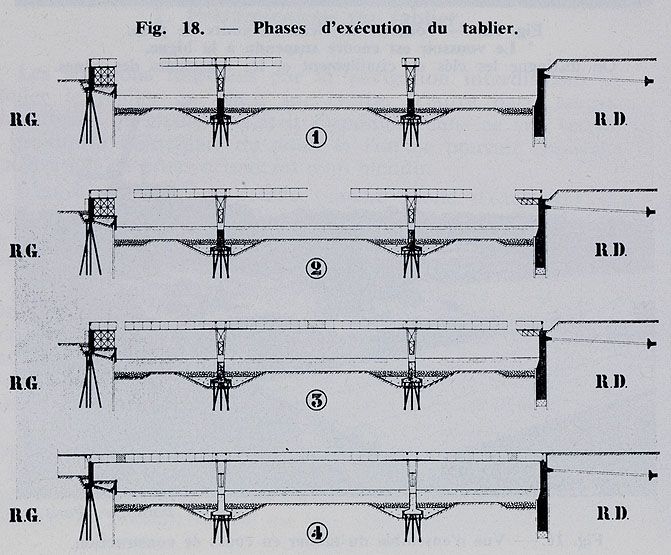 Choisy-le-Roi. Pont de Choisy (n°2). Schémas expliquant les phases successives de construction du tablier. Tiré de : Travaux, janvier 1966, n° 372.