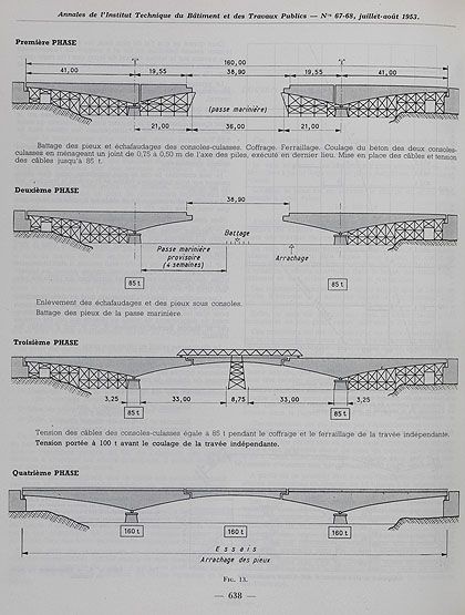 Villeneuve-Saint-Georges . Pont de Villeneuve-Saint-Georges (n°3). Schémas des phases successives de construction de l'ouvrage. Tiré de : Annales de l'Institut technique du bâtiment et des travaux publics, 6e année, n°67-68, juillet-août 1953.