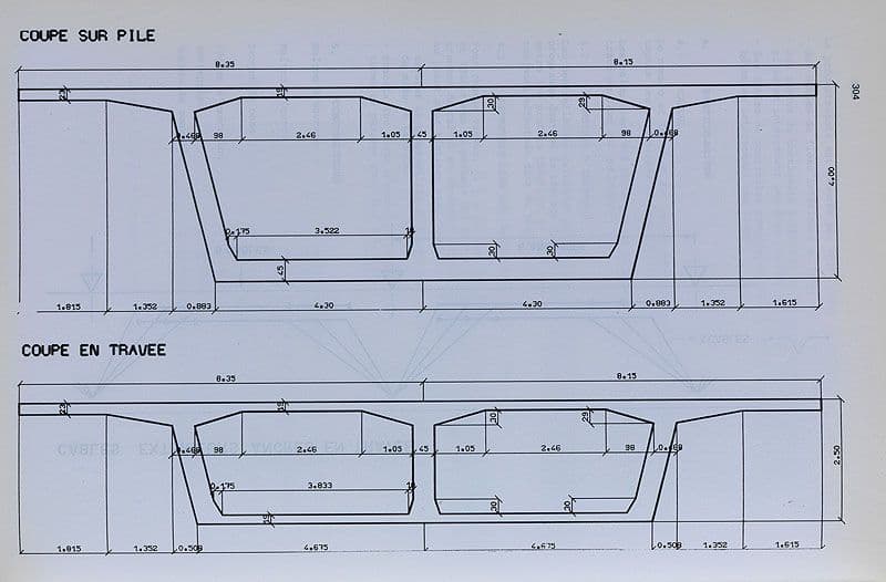 Choisy-le-Roi, Alfortville, Vitry-sur-Seine. Pont de Choisy de l'A86. Coupes cotées du tablier du viaduc de la darse d'Alfortville . Tiré de : Choisy-le-Roi, construction du pont de l'autoroute A86" / Bulletin annuel AFPC (Association française pour la construction)", 1983-84, p. 224-226, 385-386.