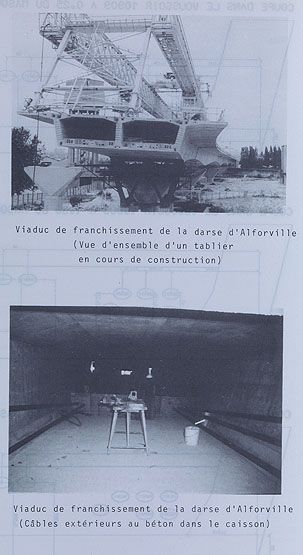 Choisy-le-Roi, Alfortville, Vitry-sur-Seine. Pont de Choisy de l'A86. Vue d'un tablier en cours de construction et vue des câbles extérieurs à l'intérieur d'un caisson. Tiré de : Choisy-le-Roi, construction du pont de l'autoroute A86" / Bulletin annuel AFPC (Association française pour la construction)", 1983-84, p. 224-226, 385-386.