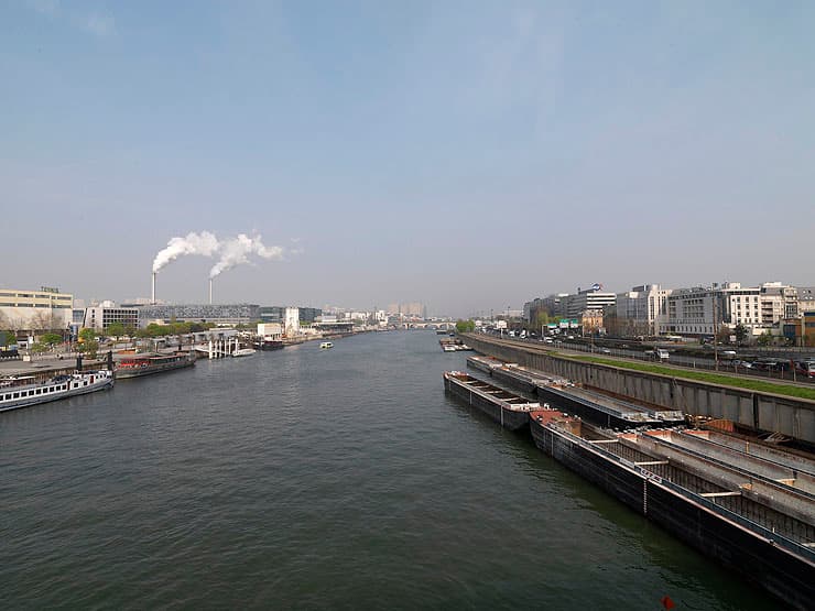 Ivry-sur-Seine. Vue depuis la Seine vers Paris. A gauche, le port d'Ivry, à droite des barges à quai à Charenton-Le-Pont.