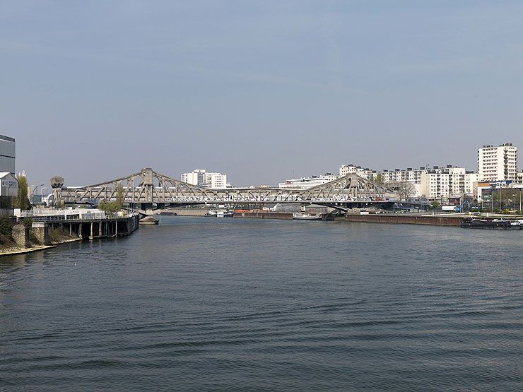 Ivry-sur-Seine, Charenton-le-Pont. Passerelle industrielle d'Ivry-Charenton. Vue d'ensemble rapprochée depuis l'amont.