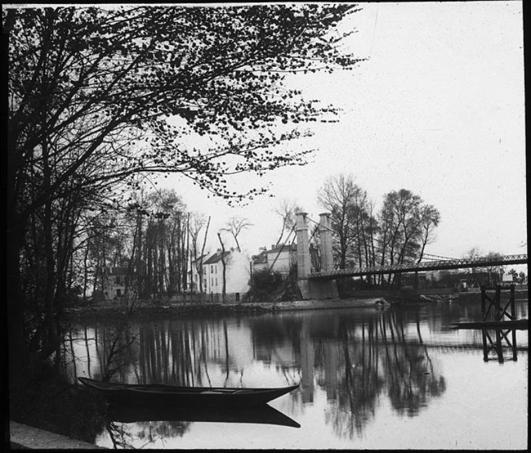Pont suspendu de Villeneuve-Saint-Georges (n°1). Vue du pont suspendu, côté Villeneuve-le-Roi. Photographie, vers 1901. (Médiathèque de l'architecture et du patrimoine, archives photographiques)