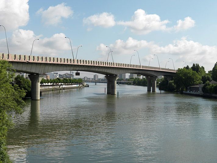 Choisy-le-Roi, Alfortville, Vitry-sur-Seine. Pont de Choisy de l'A86. Vue d'ensemble depuis la rive d'Alfortville, côté aval.