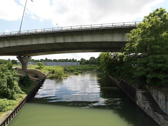 Choisy-le-Roi, Alfortville, Vitry-sur-Seine. Pont de Choisy de l'A86. Vue rapprochée du viaduc enjambant la darse d'Alfortville.
