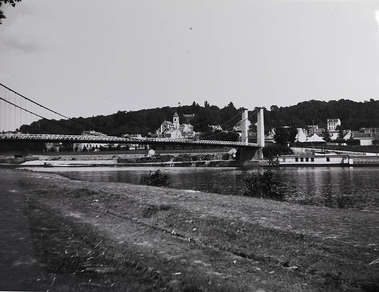 Villeneuve-Saint-Georges. Le pont suspendu de Villeneuve-Saint-Georges, depuis la rive de Villeneuve-le-Roi. (Musée municipal, Brunoy)