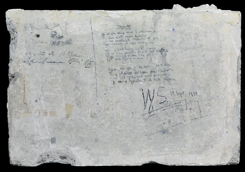 « illisible » Détail : « Départ Je m'en vais vers l'inconnu En suivant mon destin Et en laissant tristement ici Mon bonheur et mes chagrins La vie fut belle en ce pays Ou je n'ai plus le droit de rester [...] chose trop jolie Doit une fois cesser Adieu, oh pays de ma jeunesse Non, laisse moi crier Au Revoir [...] moi j'ai fait une promesse Je veux garder tout mon espoir WS. / 1er sept. 1942 ».