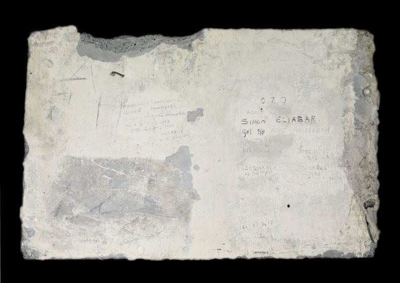 « [Étoile de David] _ Françoise Lewinsohn _ Marcel Lewinsohn _ à Lyon et après Grenoble _ arrivés le : 16-2-1944 _ déportés le : 7-3-1944 _ COURAGE _ ESPOIR »., « O.Z.O (souligné) _ ADOLF KLEIN _ EN _ SIMON ELIASAR _ geb 9.8.1885 ROTTERDAM _ HOLLAND _ ANNGECOMEN 10 December 1943 _ VERKANNEN DECEMBER _ 1943 _ 17 Dec. 1943 », « ICI ETAIT ».