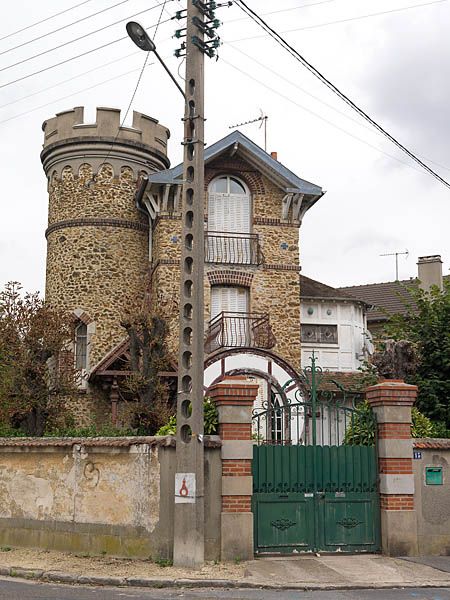 Ablon-sur-Seine, maison, 15 rue Edouard-Juvigny. Pavillon en meulière d'une travée, élevée sur trois niveaux, flanquée d'une tour couronné de créneaux d'inspiration médiévale évoquant un donjon.
