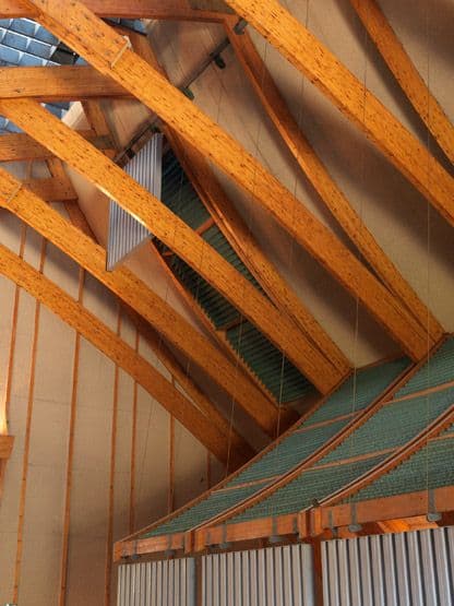 Détail de la charpente en bois lamellé-collé et du système de cloisonnement mobile. L'un des éléments est resté en position haute, tandis que les autres sont abaissés.