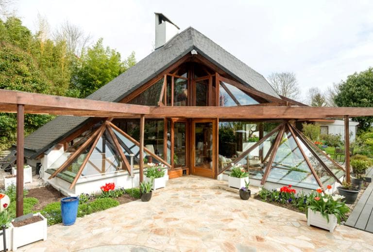 Vue générale de la façade latérale gauche : porte vitrée et vérandas pyramidales.