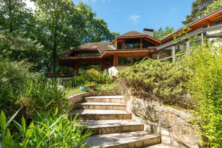 Vue de la façade principale avec escalier menant à la maison.