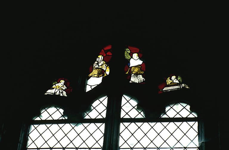 Fragments d'une verrière du 16e siècle : 4 anges musiciens dans le tympan.