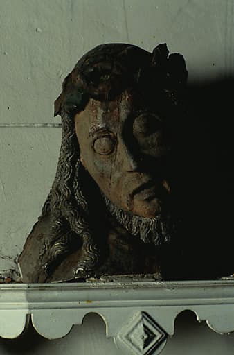 Statue en chêne datant du 15e siècle dont il ne subsiste que la tête.