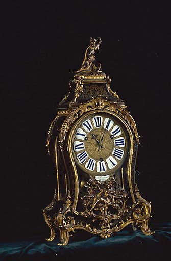 Vue d'ensemble du cartel signé Jean Martinot, et daté du 1er quart du 18e siècle ; mouvement de Daronneau.