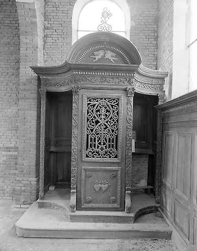 Vue du confessionnal, bois, décor dans la masse et rapporté, peint faux bois et faux or, réalisée vers 1850.