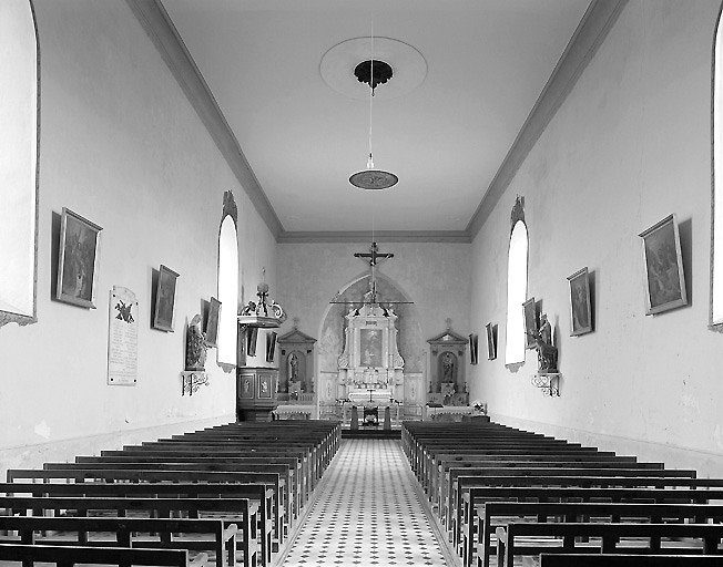 Vue, depuis l'entrée de la nef, sous la tribune de l'harmonium, de la nef et du choeur.