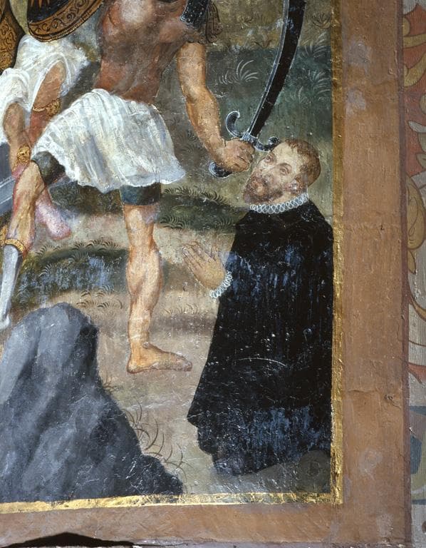 Détail de la partie latérale droite : personnage noble, agenouillé, en prière.