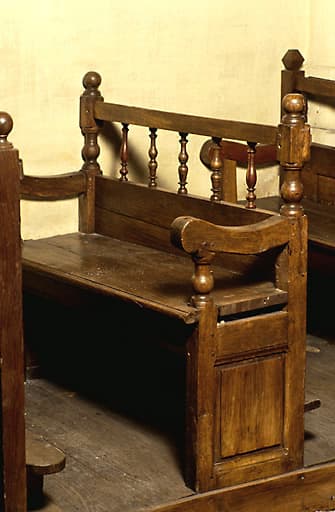 Vue d'ensemble d'un banc, situé sur un bas-côté, en chêne, datant de la 2e moitié du 17e siècle.