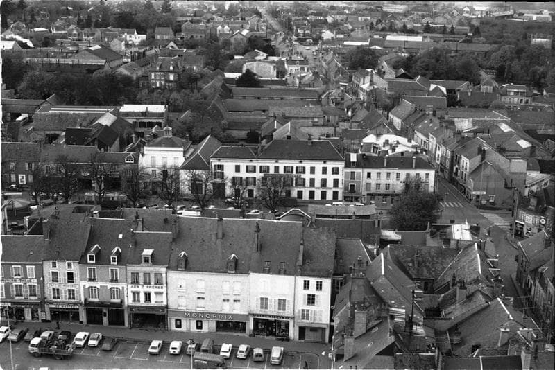 Quartier ouest de la vieille ville, délimité par la place du Martroi au premier plan, la rue de la Couronne à gauche et la rue de la Beauce à droite, vue prise des hauteurs de l'église Saint-Salomon.