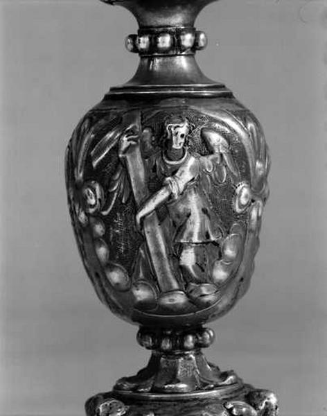 Détail du noeud : décor représentant les anges portant les instruments de la passion, la croix.