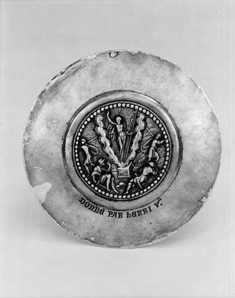 Patène représentant la Résurrection ; détail de l'inscription 'donné par henri V'.