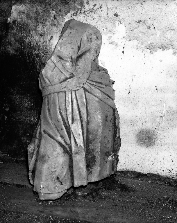 Fragment sculpté trouvé dans les combles (personnage drapé).