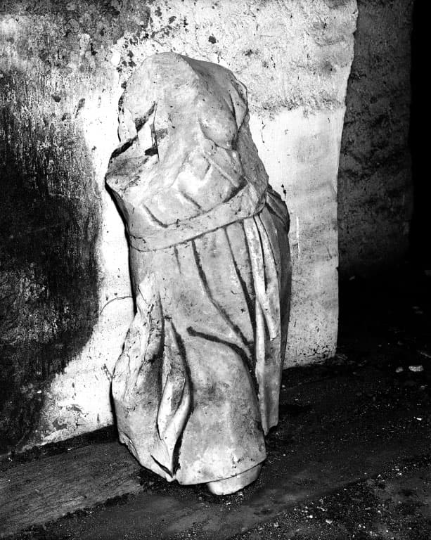 Fragment sculpté trouvé dans les combles (personnage drapé).