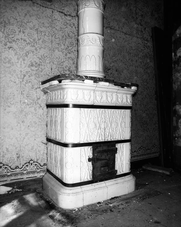 Aile ouest, combles, détail du poêle de chauffage en faïence.