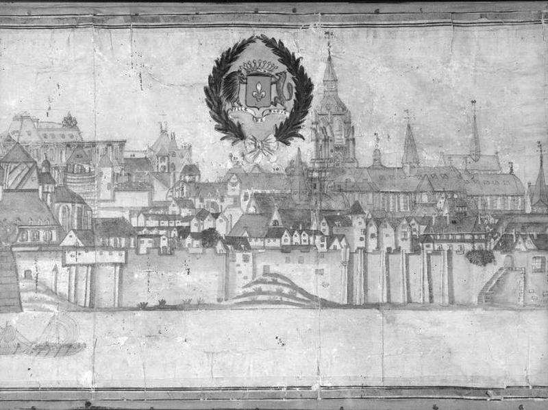 Détail du Profil de la ville de Blois veüe du Midy. Enceinte du milieu du XIVè siècle, front sud. Porte Garnaud et mur de ville au sud du cimetière de l'Hôtel-Dieu, état en 1675. Vue de Blois au XVIIème siècle.