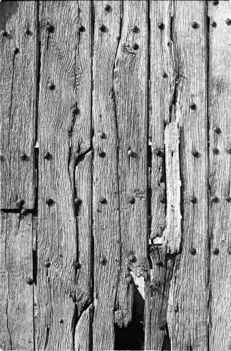 Détail de la porte en bois du portail d'entrée, avent restauration.