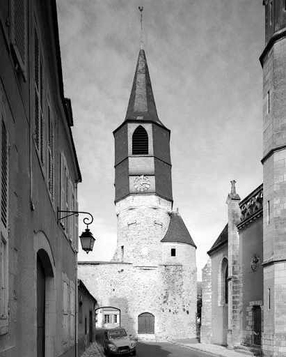 Vue générale de la courtine nord et de la tour supportant le clocher de l'église, du sud.