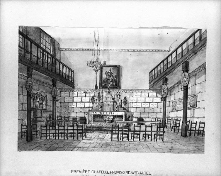 Aquarelle vers 1865 : vue intérieure de la première chapelle provisoire de saint Martin.