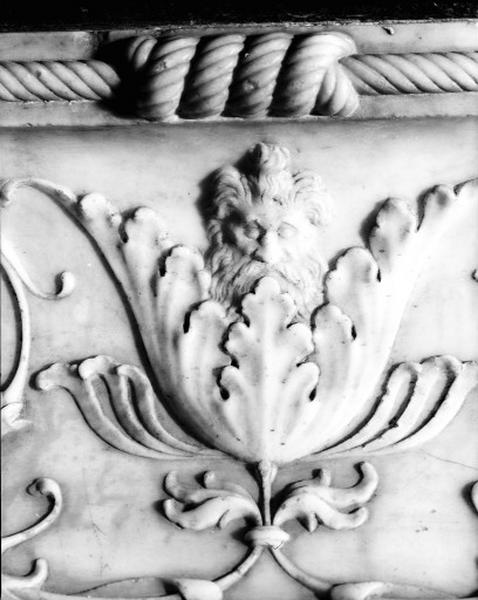 Chapelle du tombeau des enfants de Charles VII : détail d'un motif décoratif de la partie supérieure : feuillage et masque.