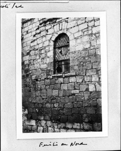 Vue de détail de la baie et de la reprise de maçonnerie du mur nord du bras nord du transept ; état en 1953.