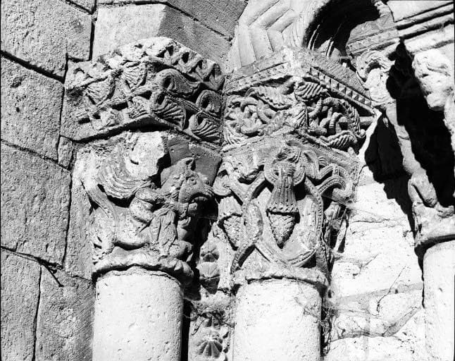 Arcade aveugle gauche, chapiteaux des colonnes de gauche : cavalier et ornements végétaux