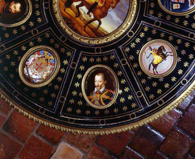 Détail d'une partie du plateau avec armoiries et portraits en porcelaine peinte.