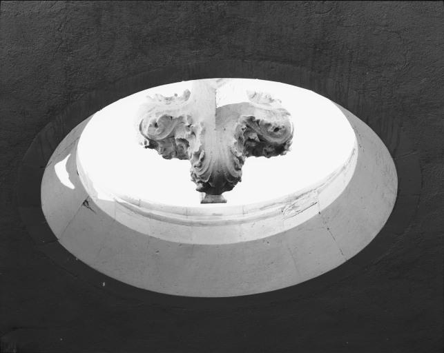 Vue de détail du fleuron surmontant un gâble en accolade, à travers l'oculus du porche d'entrée.