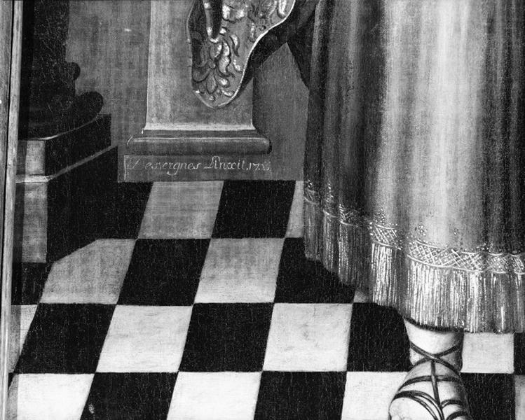 Détail. Signature de l'artiste et date de l'oeuvre. Desvergnes Pinxit 1755.