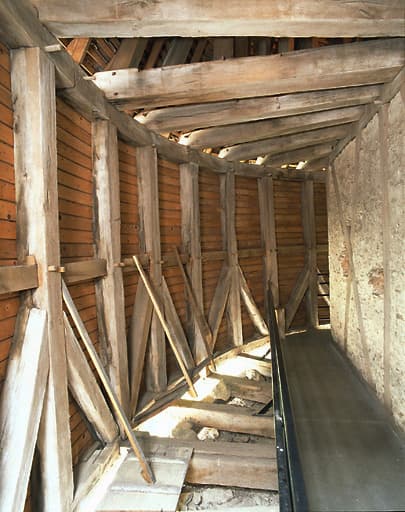 Tour du milieu : hourds, coyers s'assemblant dans les 2 sablières avec ouverture pour le tir. A droite, pan de bois de la salle de chauffe.